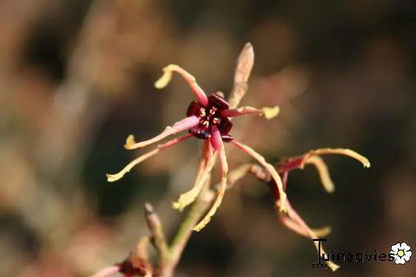 Hamamelis japonica var. flavopurpurascens is een grote, breed spreidende struik/kleine boom met gele bloemen met rood aan de basis, op het kale hout.
