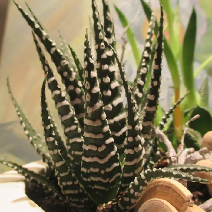 Haworthia fasciata is afkomstig uit Zuid-Afrika en vormt een rozet van bolle vlezige donkergroene bladeren met zilverwitte strepen.