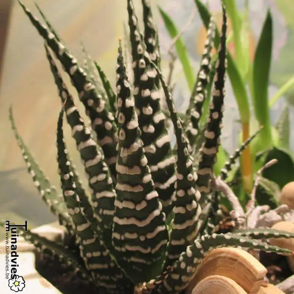 De Zebraplant wordt hier als kamerplant gehouden maar kan wel in de zomer op een terras staan, beschut van de volle middagzon. Bij teveel zon verkleuren de bladeren rood.