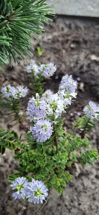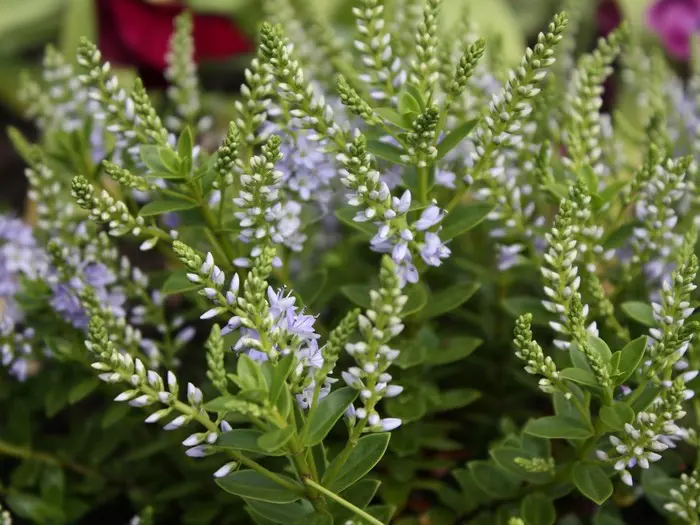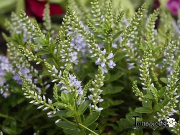 Hebe 'Margret' is een klein compact heestertje met groene bladeren en hemelsblauw naar witblauw verkleurende bloempjes.