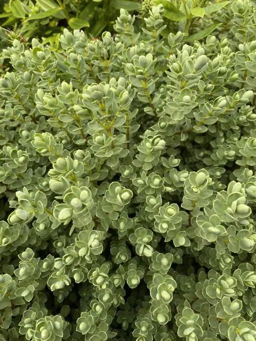 Hebe topiaria is een compact bolvormig struikje met grijsgroene blaadjes en groengele randen.