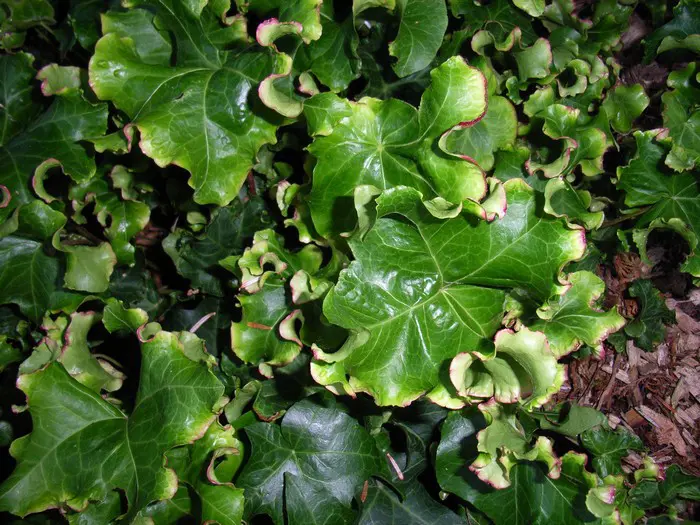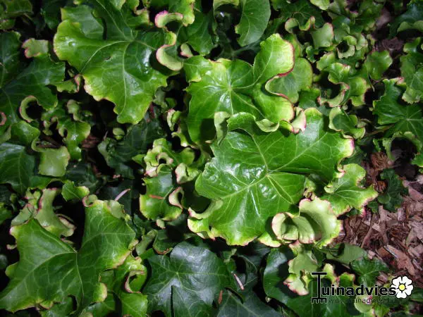 Hedera helix 'Melanie' is een compactgroeiende klimop met golvende/gekroesde paarse bladranden.