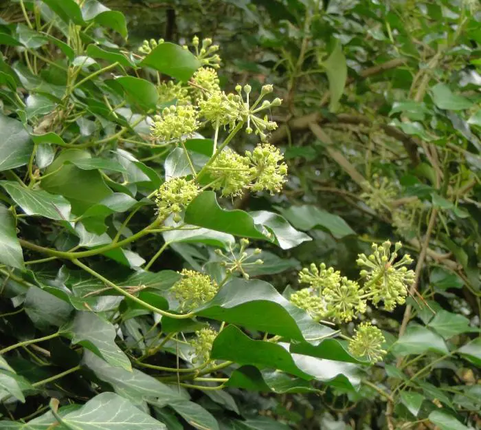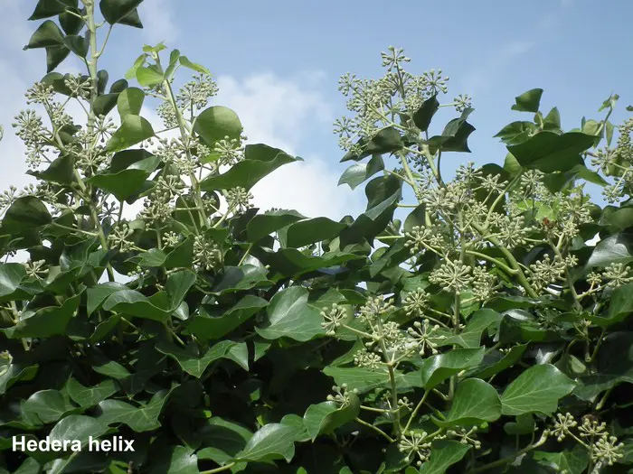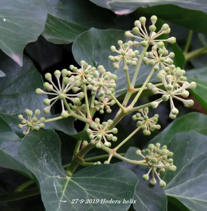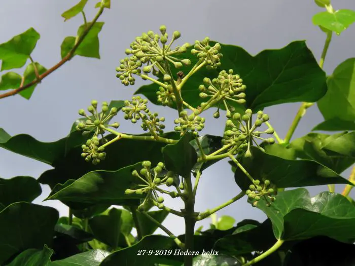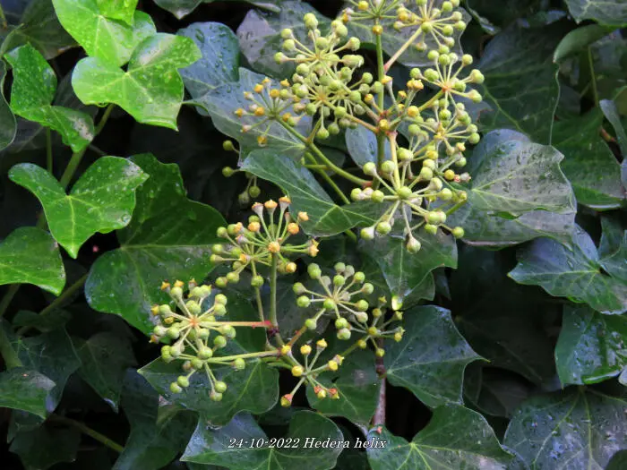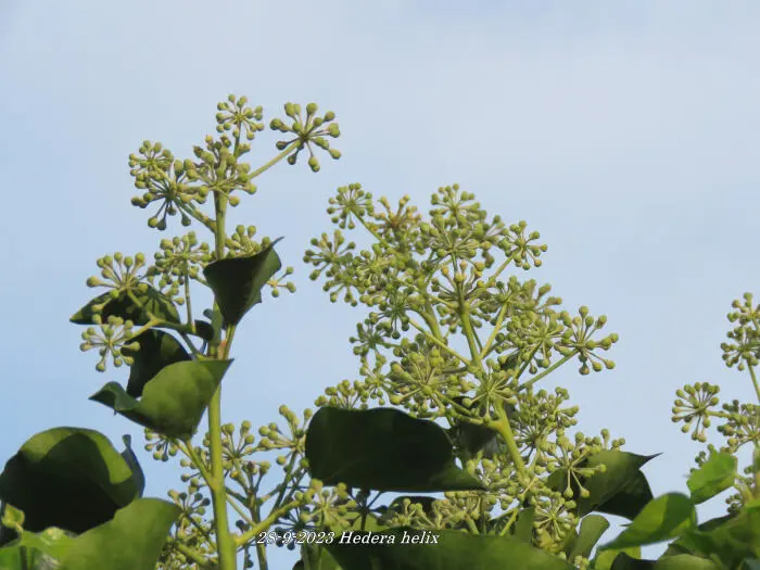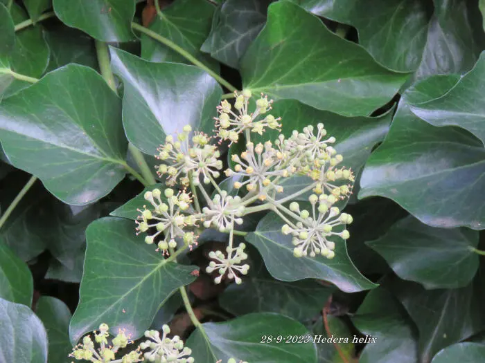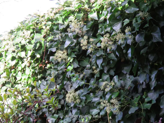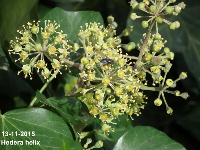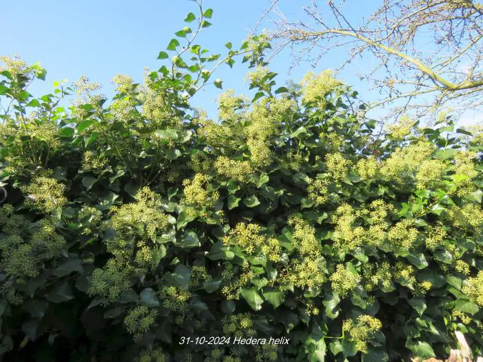In het najaar bloeien de groengele bloempjes die intensief worden bezocht door allerlei soorten bijen.