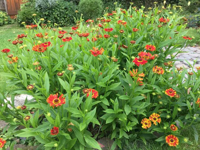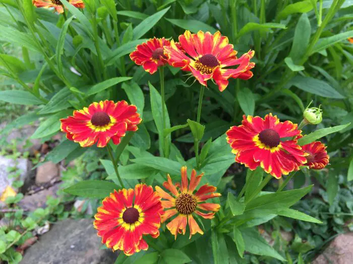 Helenium 'Poncho' bloeit met grote bloemen, bloeien van rood met een gouden randje naar oranje gevlamd met rood.