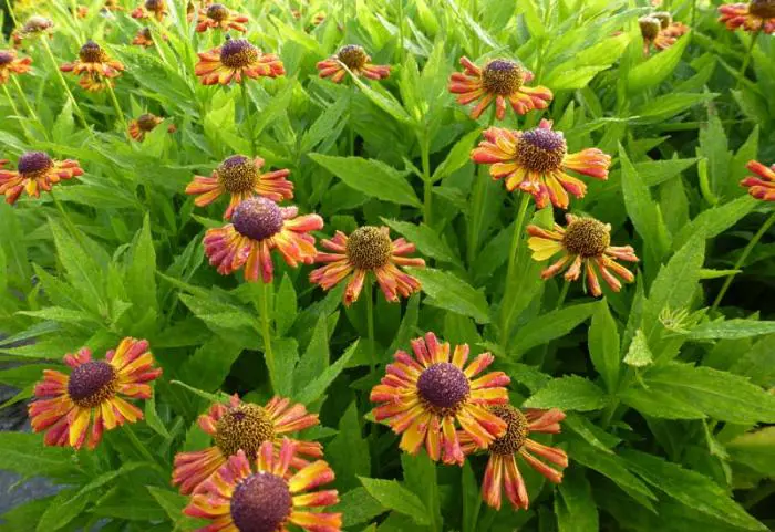 Helenium 'Tie Dye' bloeit met grote originele bloemen met opgerolde bloembladen, oranje aan de bovenkant, rood aan de achterkant.