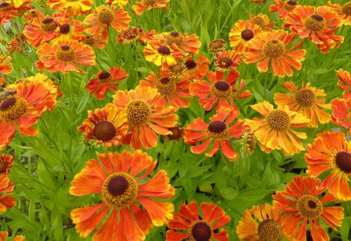 Helenium 'Wonadonga' bloeit met grote roodbruinoranje bloemen met een geel randje.