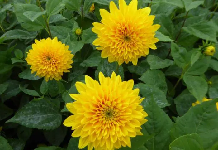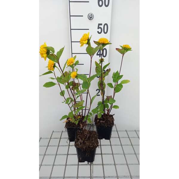 Helianthus decapetalus 'Soleil d'Or' vormt een rozet van ovale, donkergroene bladeren die in stijve en vertakte stengels oprijzen tot een dichte en brede struik en rijkelijk bloeit met zeer gevulde, goudgele bloemen.