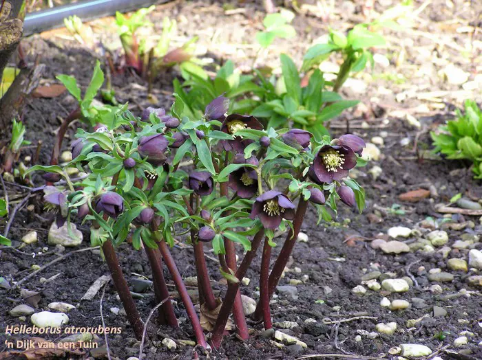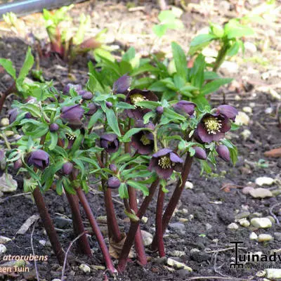 Helleborus atrorubens bloeit vroeg met knikkende groene tot donkerpurpere bloemen op lange stengels.