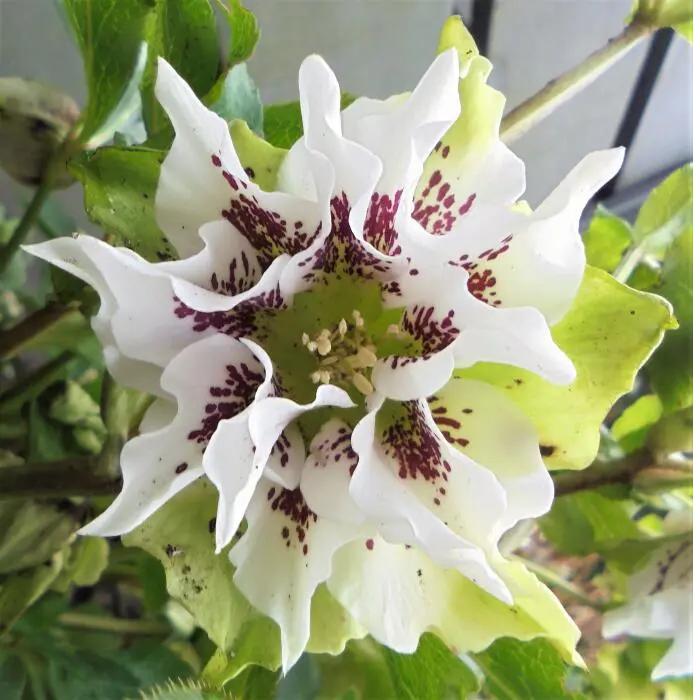 Helleborus orientalis 'Double White Spotted' is dubbelbloemig waarvan de witte bloemblaadjes roodpaars gespikkeld zijn.