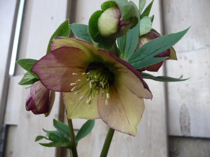 Helleborus orientalis 'Picotee' heeft opvallend purper geaderde, witroze bloemblaadjes.