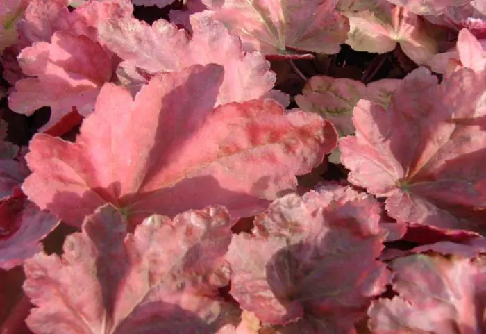 Heuchera 'Autumn Leaves' heeft mooie rode bladeren die naar de herfst toe donkerder rood worden.