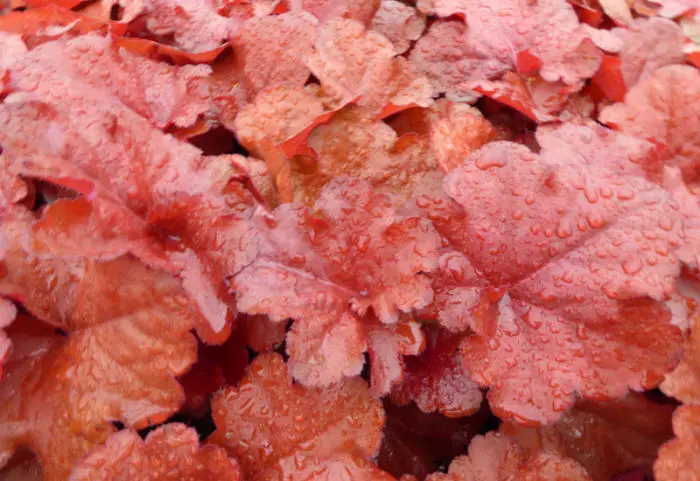 Heuchera heeft zogenaamde wortelbladeren, die met een lange steel direct aan de wortel van de plant vastzitten. De bladeren van alle Heuchera-soorten zijn sierlijk hartvormig.