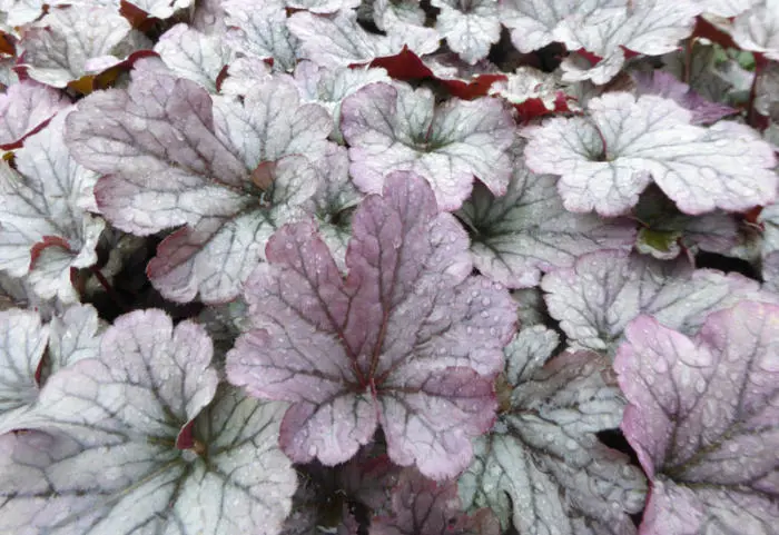 Het blad van de Heuchera 'Sloebberry' is zilverpaars.