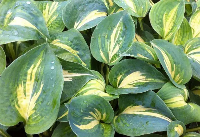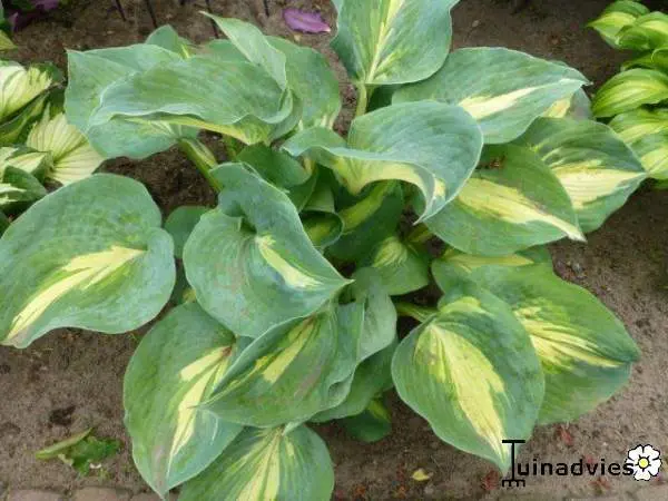 Hosta 'Dream Weaver' stevig blauwgroen blad met gele vlek in het midden.