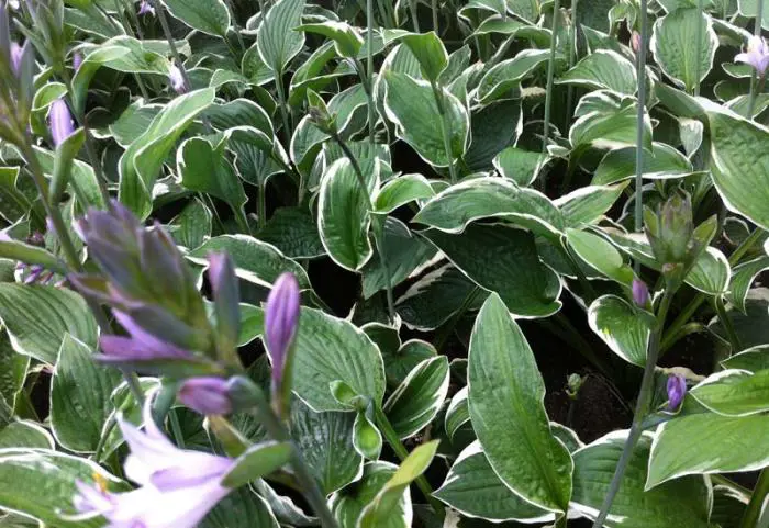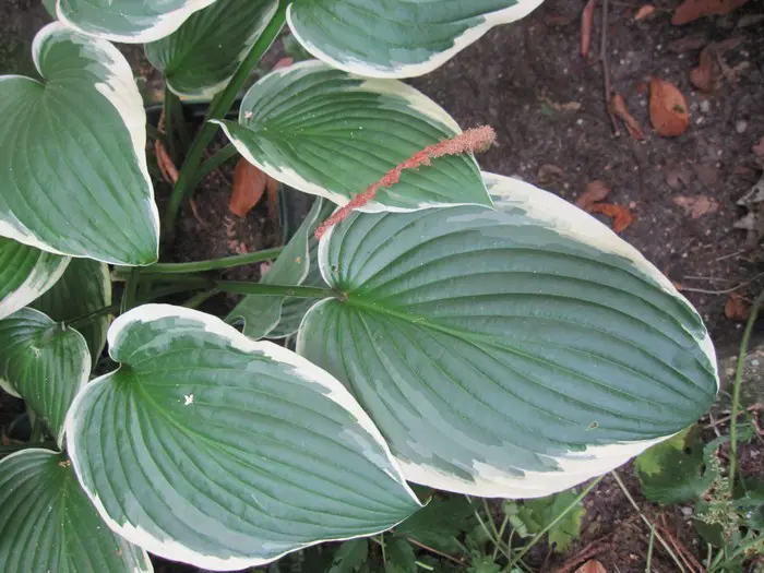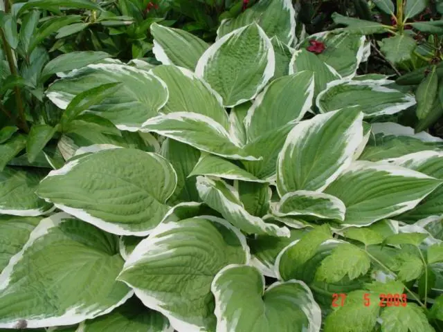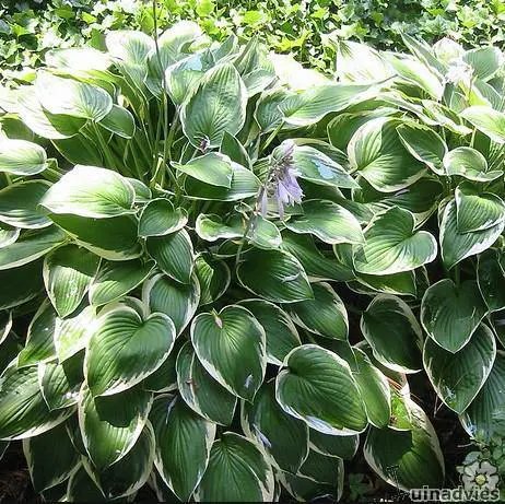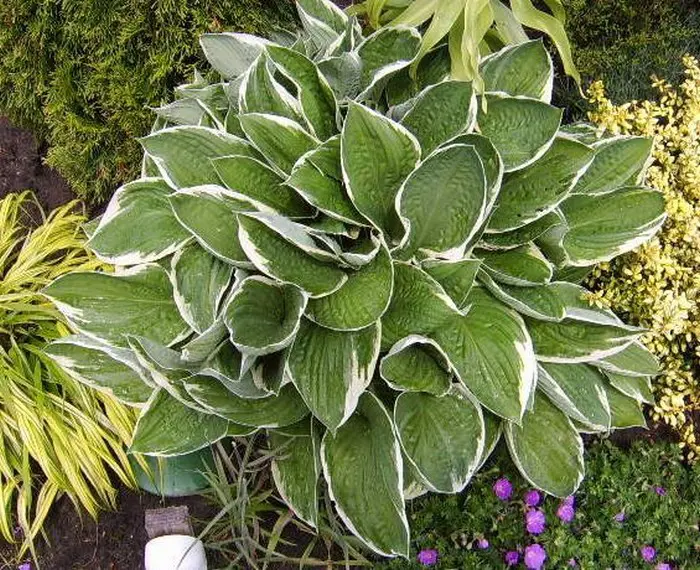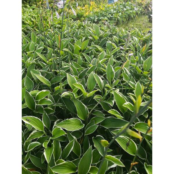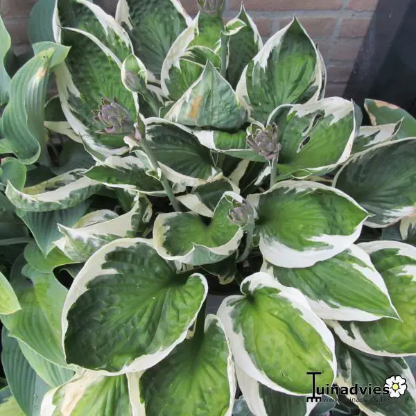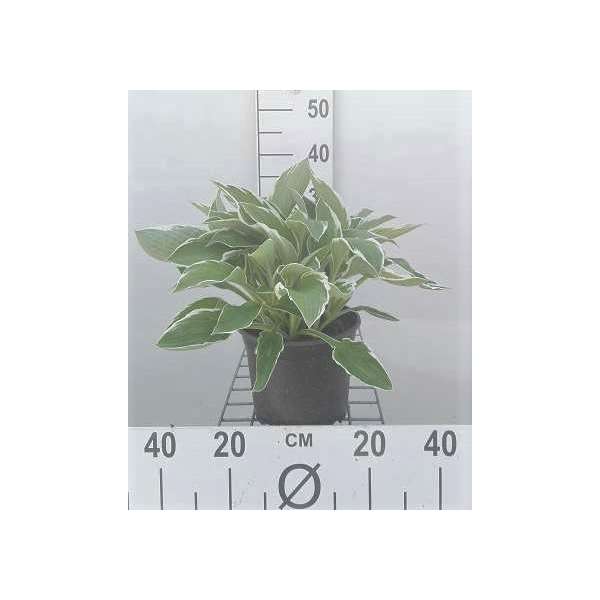 Een snelgroeiende hosta met olijfgroen blad en wit gerand.