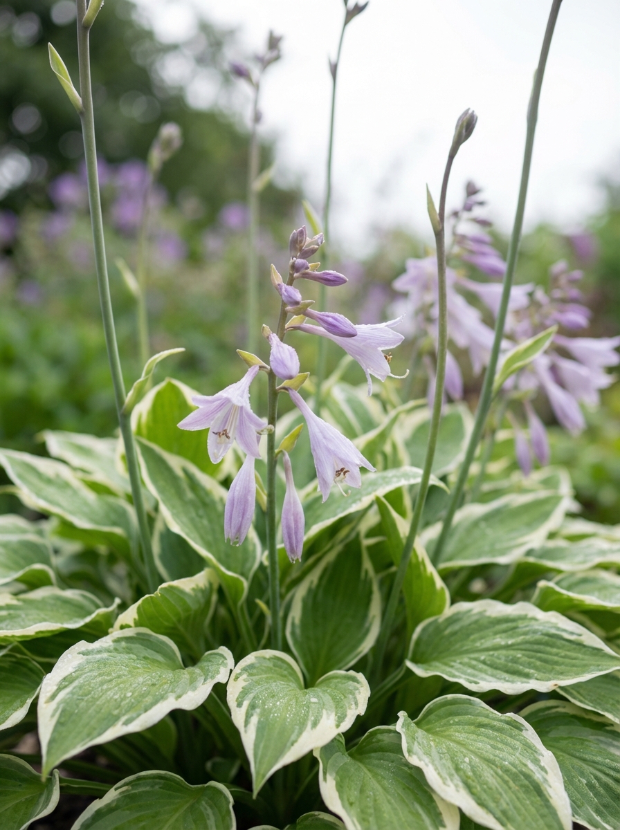 Hosta fortunei 'Moerheim' heeft hartvormige groene bladeren met geel tot wit verkleurende randen.
