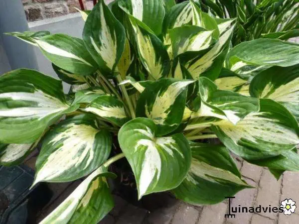 Hosta 'Revolution' is een erg mooie Hosta met donkergroen glanzend blad waarvan het centrum wit met groen gespikkeld is.