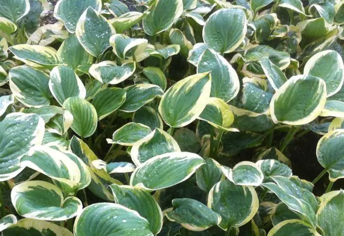 Hosta ' Shade Fanfare ' heeft verkleurende bladeren van groen met gele rand tot geel met witte rand.