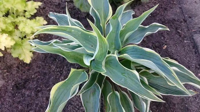 Hosta 'Valley's Paparazzi' heeft lange puntige blauwe bladeren. De gele bladranden verkleuren later cremewit.