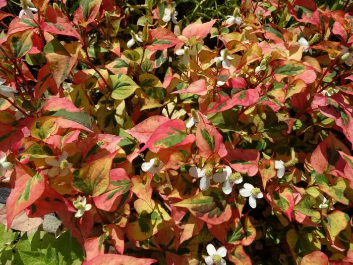 Houttuynia cordata 'Joker's Gold' heeft decoratieve driekleurige bladeren met geel/groen/rood.