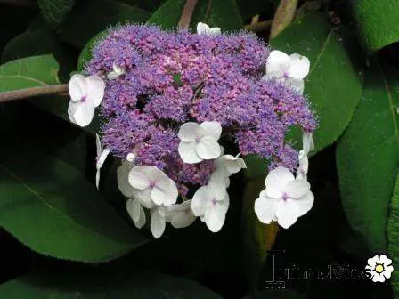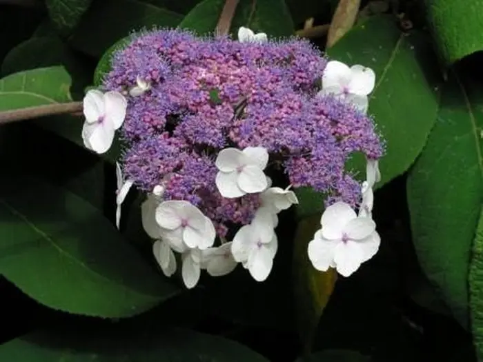 Hydrangea aspera ssp. sargentiana is een forse heester, met de neiging tot woekeren. Heeft dikke behaarde takken en grote ovale bladeren met schermvormige bloemen, in het midden de fertiele lilapaarse bloempjes met aan de buitenkant de witte randbloemen.