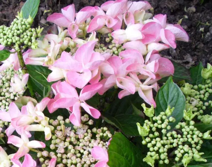 Hydrangea macrophylla 'Beijing' is een schermbloemige hortensia met licht gedraaide bloemblaadjes.