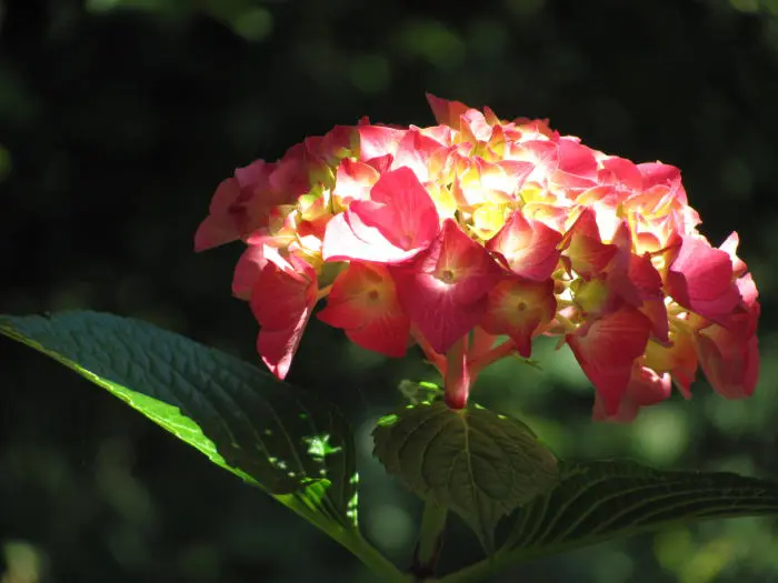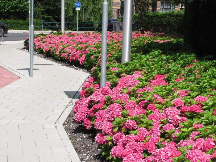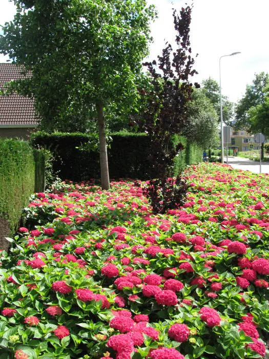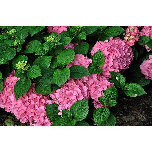 Hydrangea macrophylla 'King George V' vormt een compacte struik met bolvormige bloemen op stevige rechte stengels. Bloeien van roze naar dieproze.