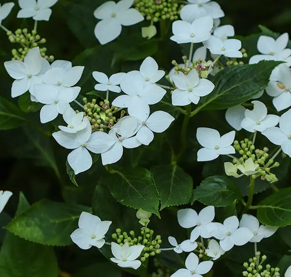 Hydrangea 'Lanarth White' is een teller-hybride met witte bloemtuilen die later in de schaduw naar groen verkleuren.