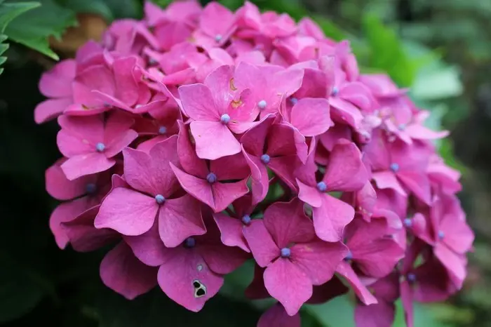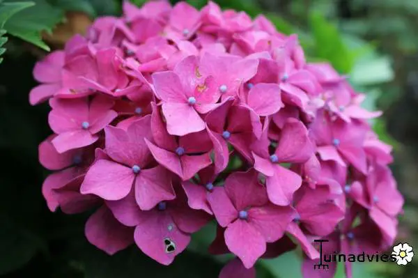 Hydrangea macrophylla 'Leuchtfeuer' bloeit met kleine rozerode bloemblaadjes.