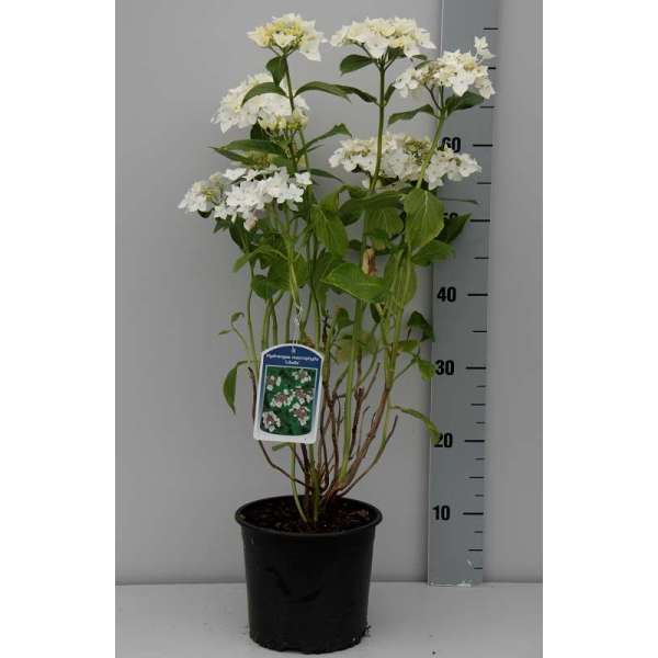 Hydrangea macrophylla 'Libelle' is een traaggroeiende hortensia met vlakke bloemschermen. De sneeuwwitte randbloemen staan rond paarsrode fertiele bloemen.