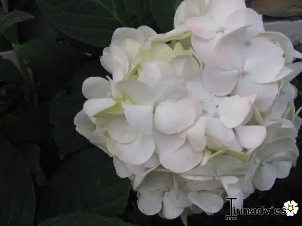 Hydrangea macrophylla 'Mme Emile Mouillère' bloeit met zuiver witte bloemen later verkleurend naar lichtroze met soms roze vlekken.