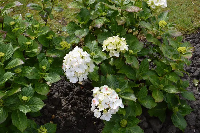 Hydrangea macrophylla ‘Nymphe’ bloeit met bolvormige witte bloemen.