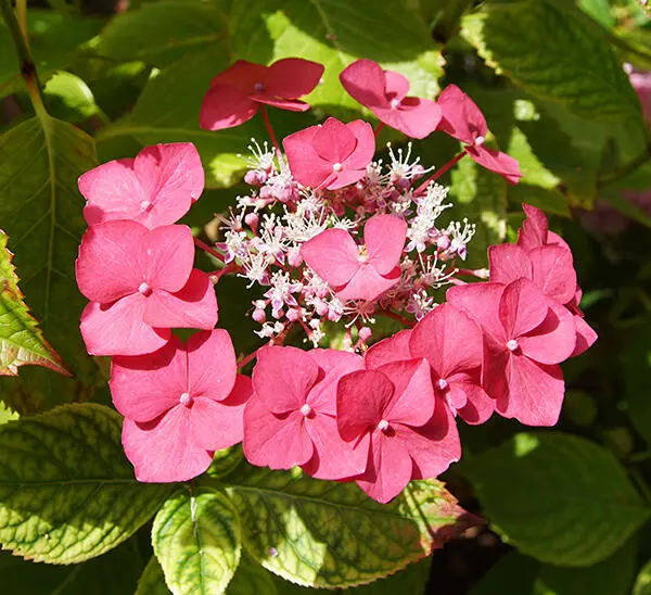 Hydrangea macrophylla 'Rotkehlchen' is een rijkbloeiende hortensia met schermbloemen. De rode tot paarse randbloemen staan rond de roze fertiele bloemen.