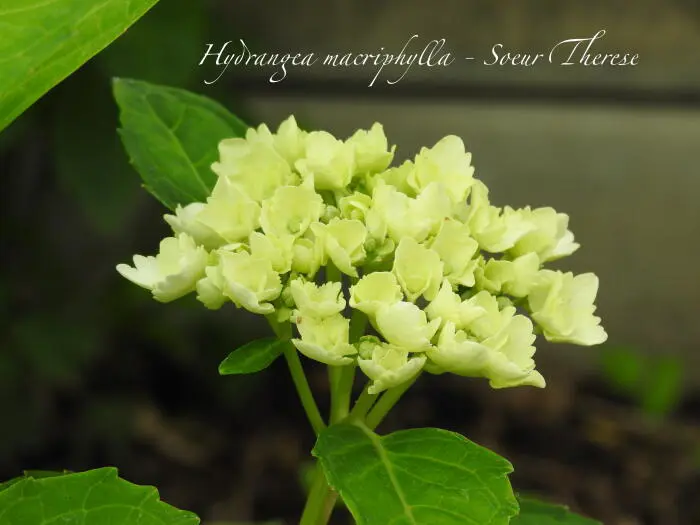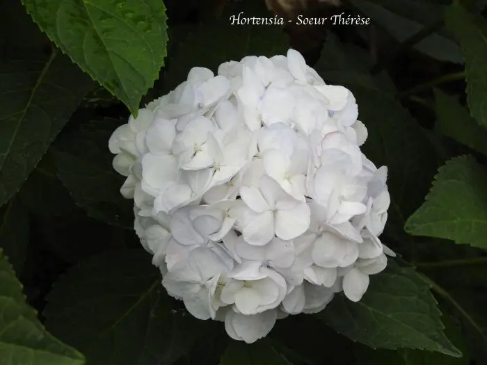Hydrangea macrophylla 'Soeur Thérèse' is een wit bloeiende bolhortensia met een zachtblauw oog in het midden van de steriele bloempjes.