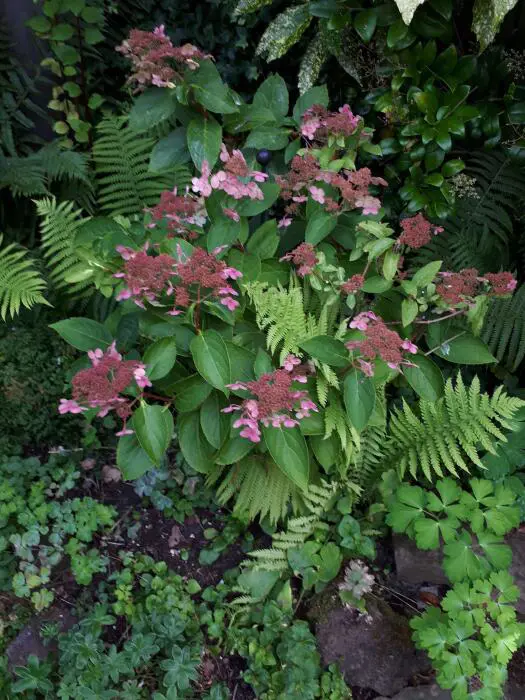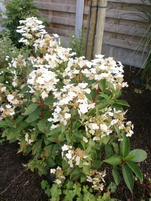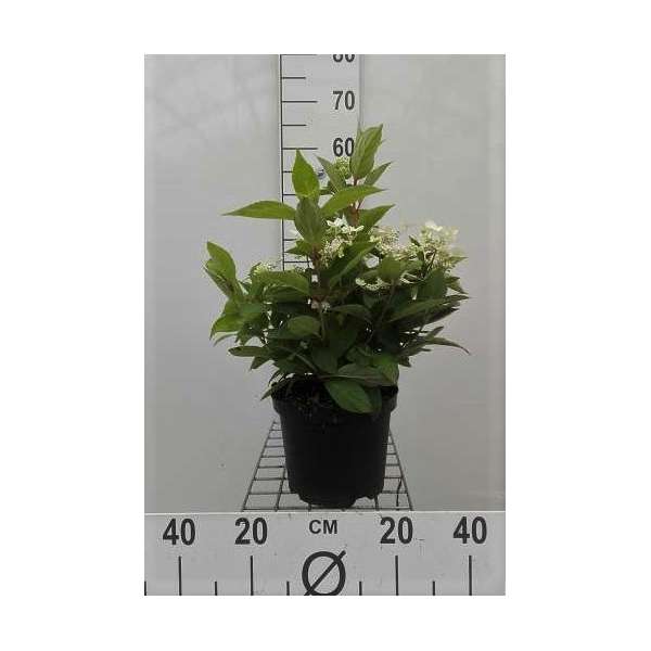 Hydrangea paniculata 'Dharuma' bloeit met groenwitte bloemen die in het najaar meer naar het roze vervagen, hebben veel randbloemen, in afgeplatte pluimen