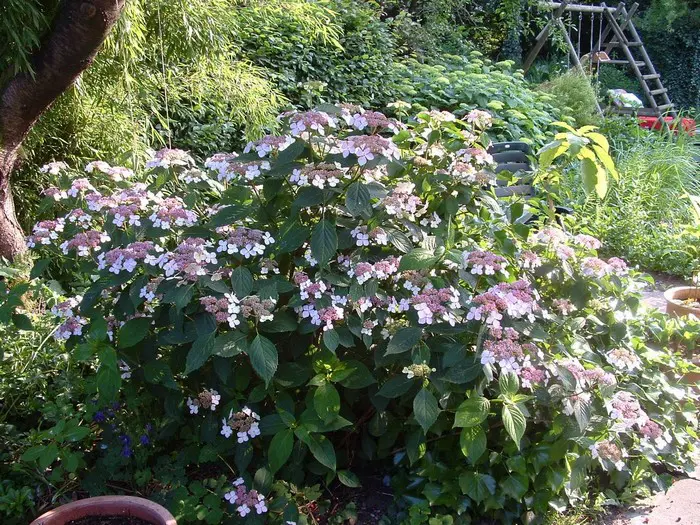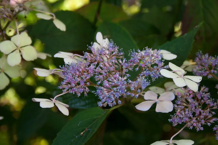 Hydrangea serrata 'Aigaku' is een laagblijvende struik en bloeit met schermvormige bloemen waarvan de fertiele bloemen blauw zijn met bleekblauwe randbloemen.