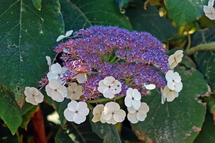 Deze hortensia heeft schermvormige bloemen, in het midden de fertiele paarse bloempjes met aan de buitenkant de wit/lila randbloemen.