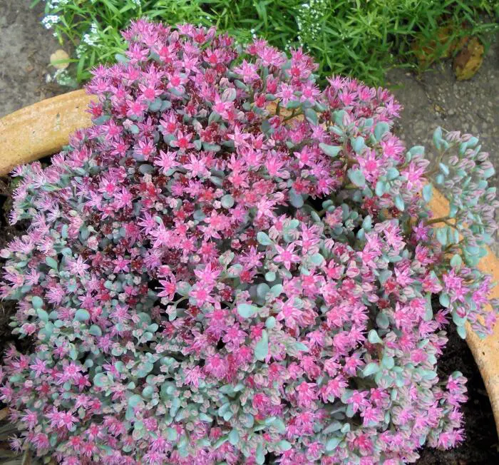 Hylotelephium cauticola 'Coca-Cola' is een rotsplantje met prachtige bloemschermen van stervormige felroze bloempjes en grijsgroene sappige blaadjes met paarsgetinte stengels.