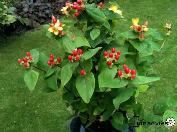 Hypericum x inodorum 'Rheingold' is een kleine, dicht verrtakte opgaande struik met elliptische ovale groene bladeren, naar rood verkleurend in de herfst.