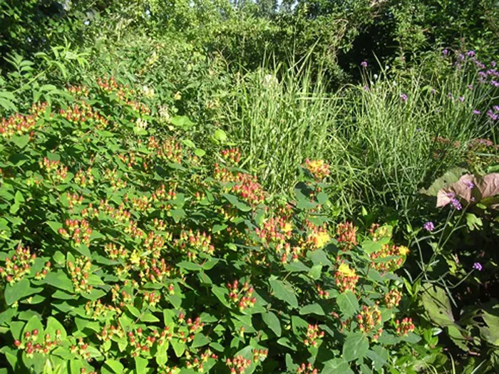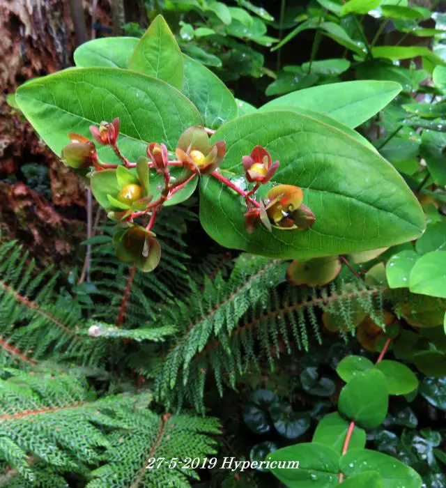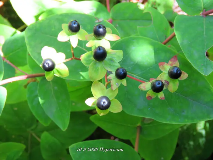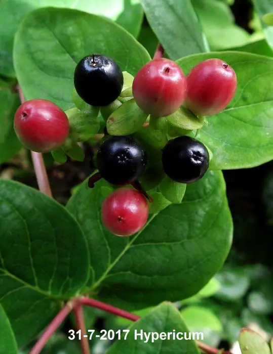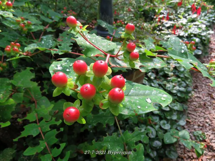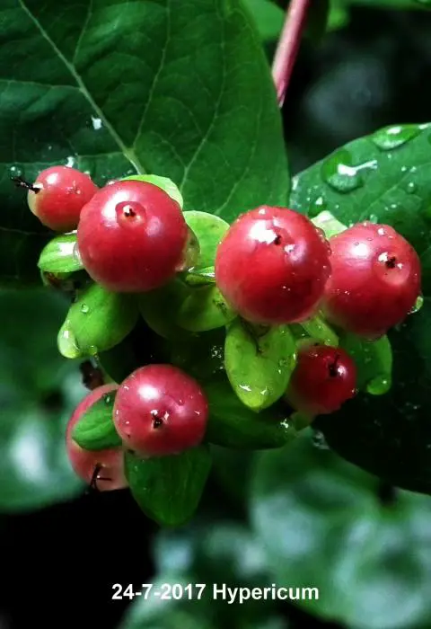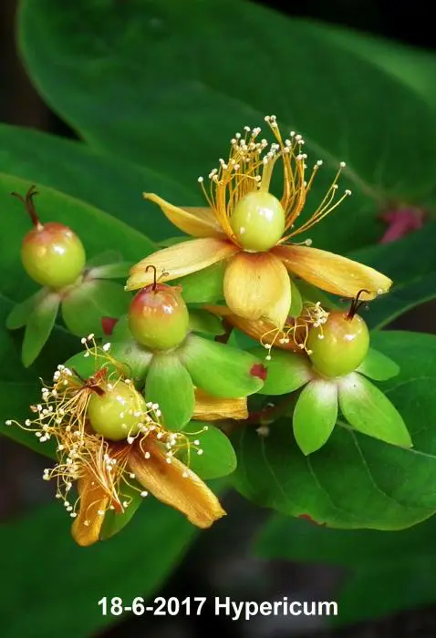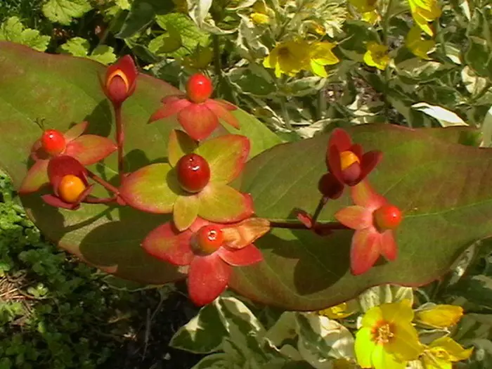 Hypericum bloeit met gele tot oranjegele bloemen gevolgd door roze, rode, roodbruine of witte bessen naargelang de variëteit.