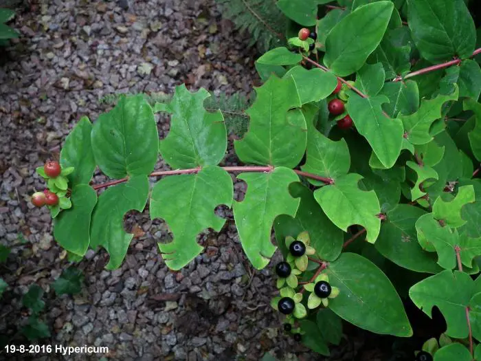 androsaemum : 80cm, 6/8, geel, zwarte bessen, kan als een laag haagje gebruikt worden.