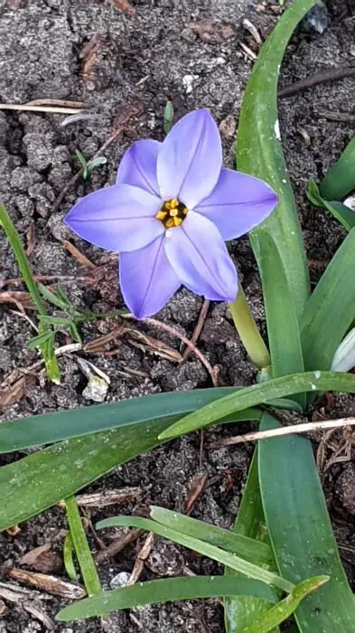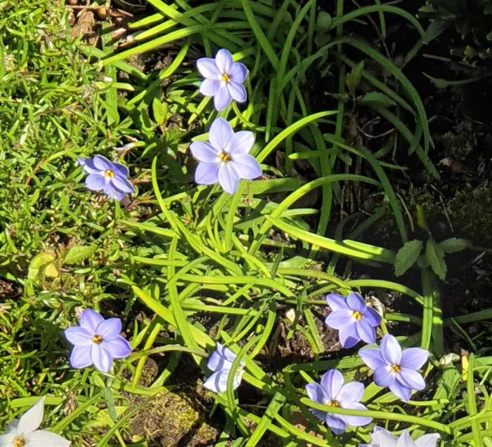 Helder diepblauwe stervormige bloempjes en gele meeldraden met wintergroen grasachtig blad dat mals aanvoelt.
