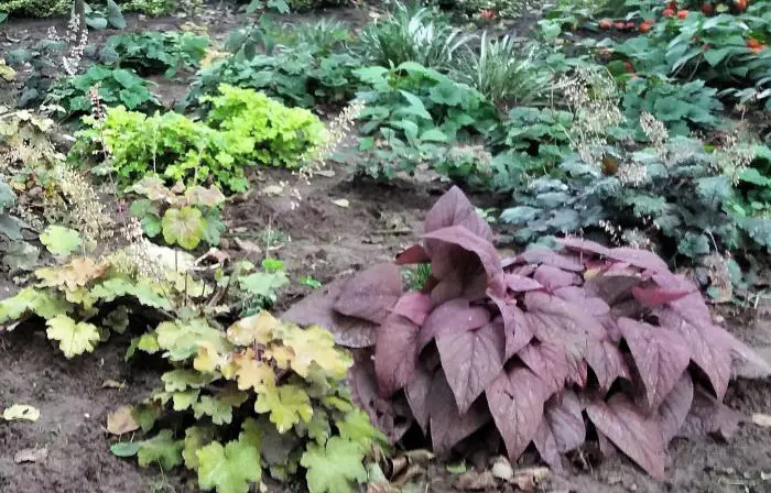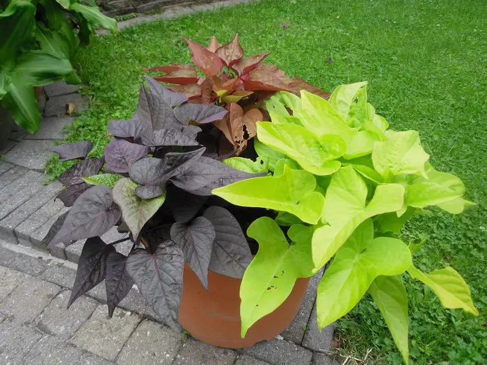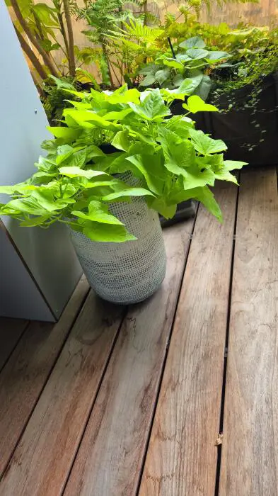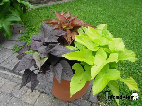 Ipomoea batatas afkomstig uit het tropisch Z-Amerika, is een snelgroeiende lage klimplant met hart-/handvormig gelobde bladeren en trompetvormige bloemen. Kunnen ook als bodembedekker gebruikt worden en over de grond liggen.