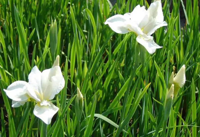 Iris sibirica 'White Swirl' met grasachtig blauwgroen blad dat tot ver in de herfst decoratief blijft.