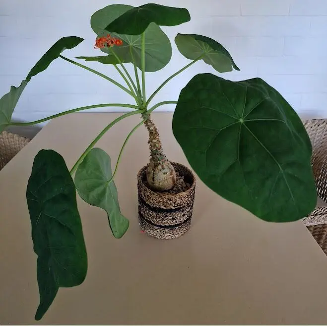 Heeft een lichtbruine opgezwollen stam (caudex) met bovenaan mooie, grote groene bladeren en koraalrode of gele bloemen aan lange stengels. De bloemen bloeien geregeld gans het jaar door.