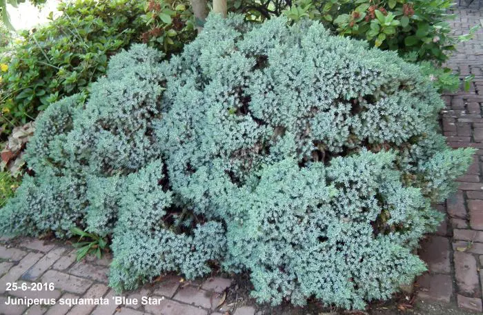 Juniperus squamata 'Blue Star' is een laagblijvend conifeertje, uitermate geschikt voor de rotstuin.