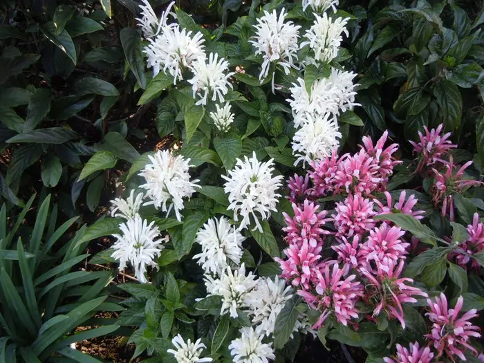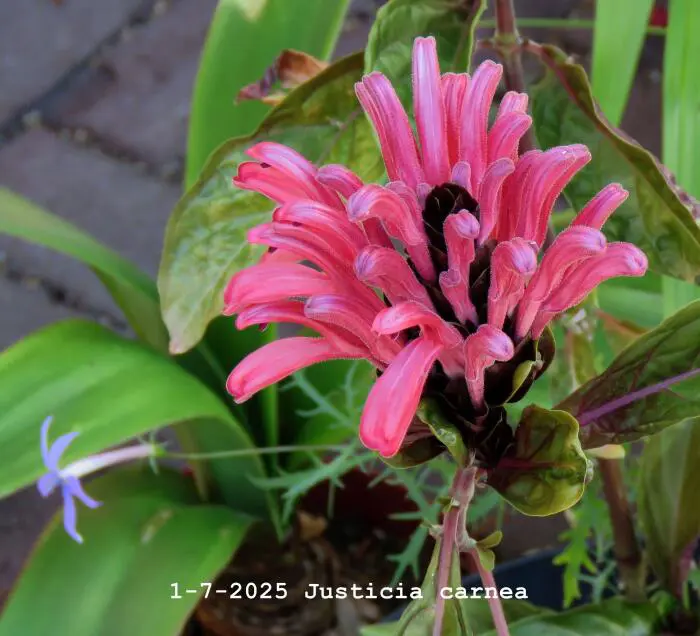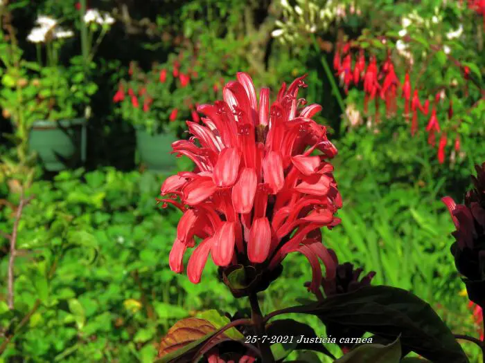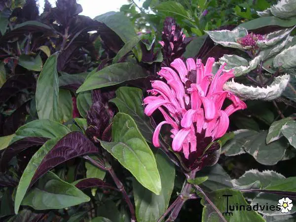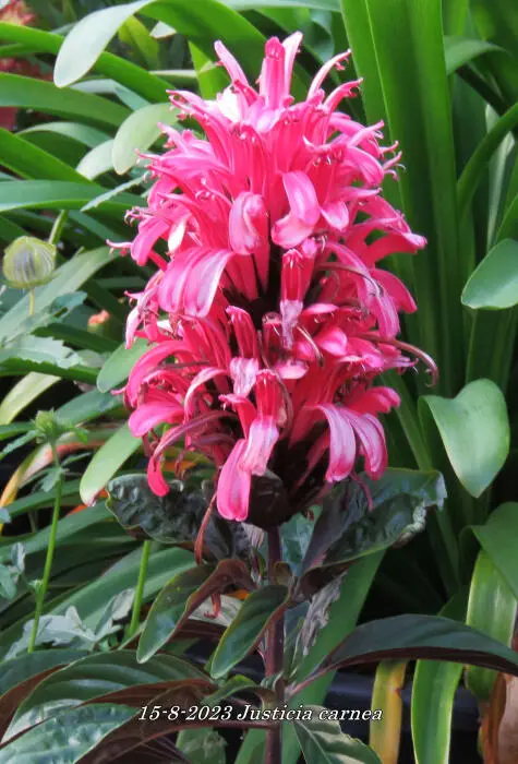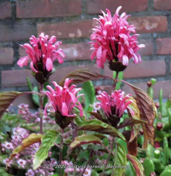 Justicia carnea heeft heel veel licht nodig en een hoge luchtvochtigheid.Ze bloeien met grote bloemen in licht roodpaars, vleeskleur of oranje.Het blad is groen en ruw behaard.De grond moet goed vochtig blijven maar droger in de winter.