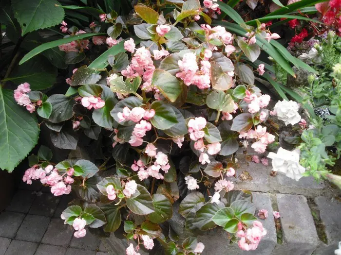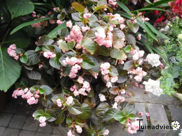 Begonia semperflorens is een bloeirijke eenjarige met glanzende, ronde, sappige bladeren en overwegend roze bloemen. Ze bestaan ook met witte of rode bloemen.