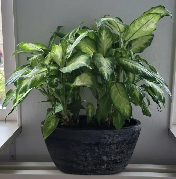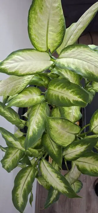 Dieffenbachia seguine heeft donkergroene grote bladeren (45cm), lichtgroen gestreept of gevlekt.