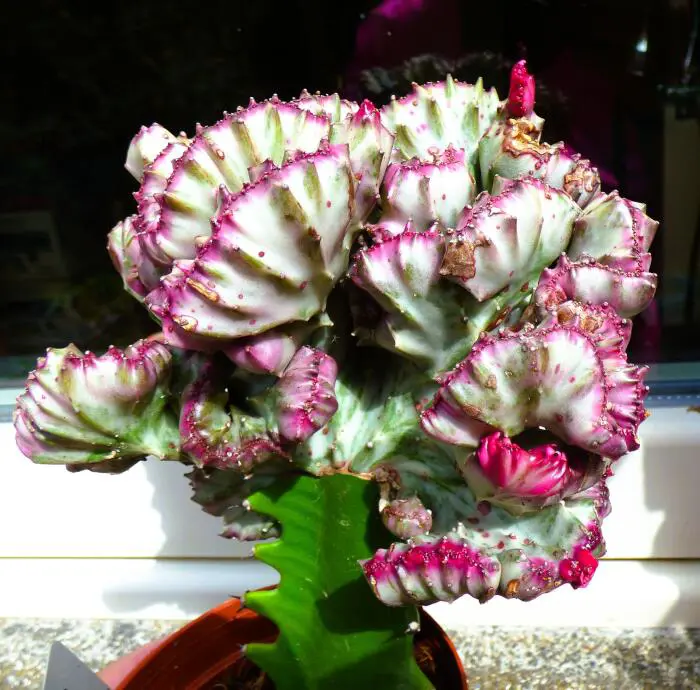 Euphorbia lactea 'Cristata' is ontstaan door Euphorbia lactea 'Cristata' te enten op een Euphorbia neriifolia basis.